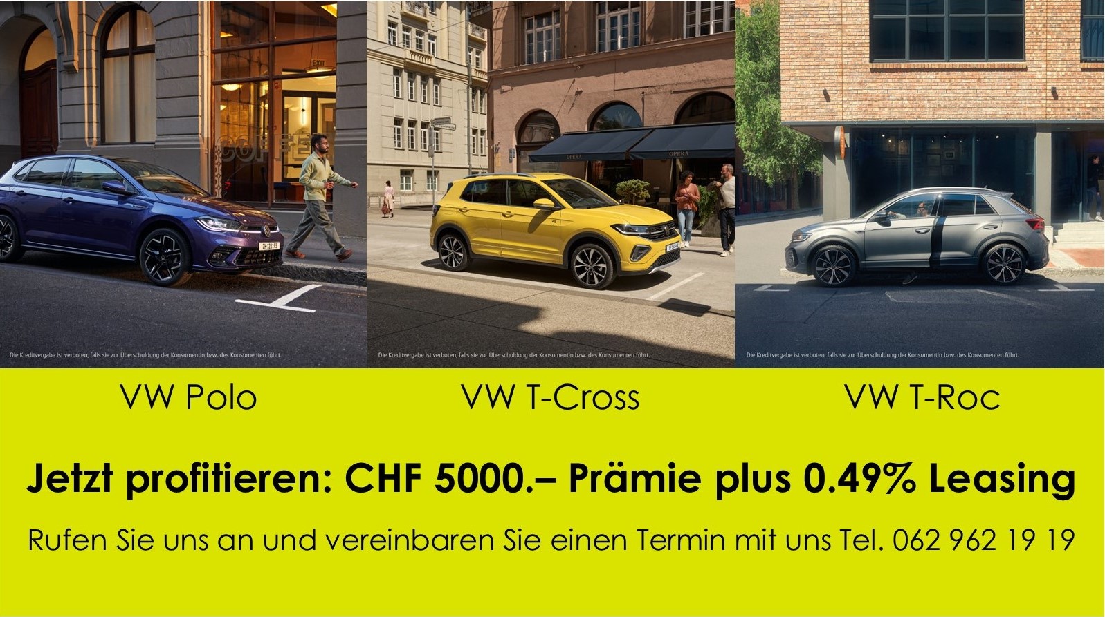 Profitieren Sie jetzt beim Kauf eines VW Polo, T-Cross oder T-Roc von CHF 5000.- Prämie plus 0.49% Leasing!